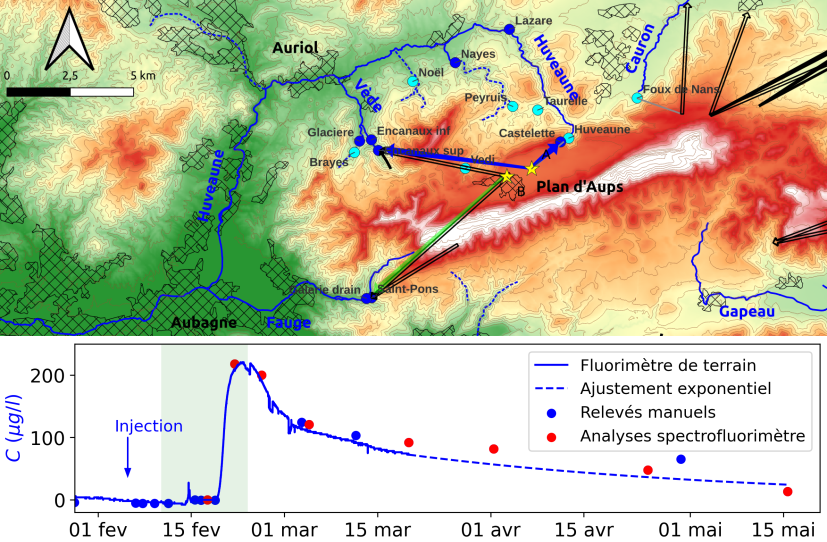Entre 2021 et 2024, la commission scientifique a proposé et réalisé trois traçages artificiels sur le massif de la Sainte-Baume occidentale. Ces opérations consistent à injecter un traceur fluorescent (neutre pour l’environnement) dans un point de circulation d’eau souterraine et de suivre les sorties d’eau à proximité. Ainsi on peut mettre en évidence les trajets des écoulements souterrains. On peut de cette manière préciser le bassin versant d’alimentation d’une source ou d’un forage. Ceci est déterminant pour des points de captage d’eau potable afin de prévenir les pollutions.